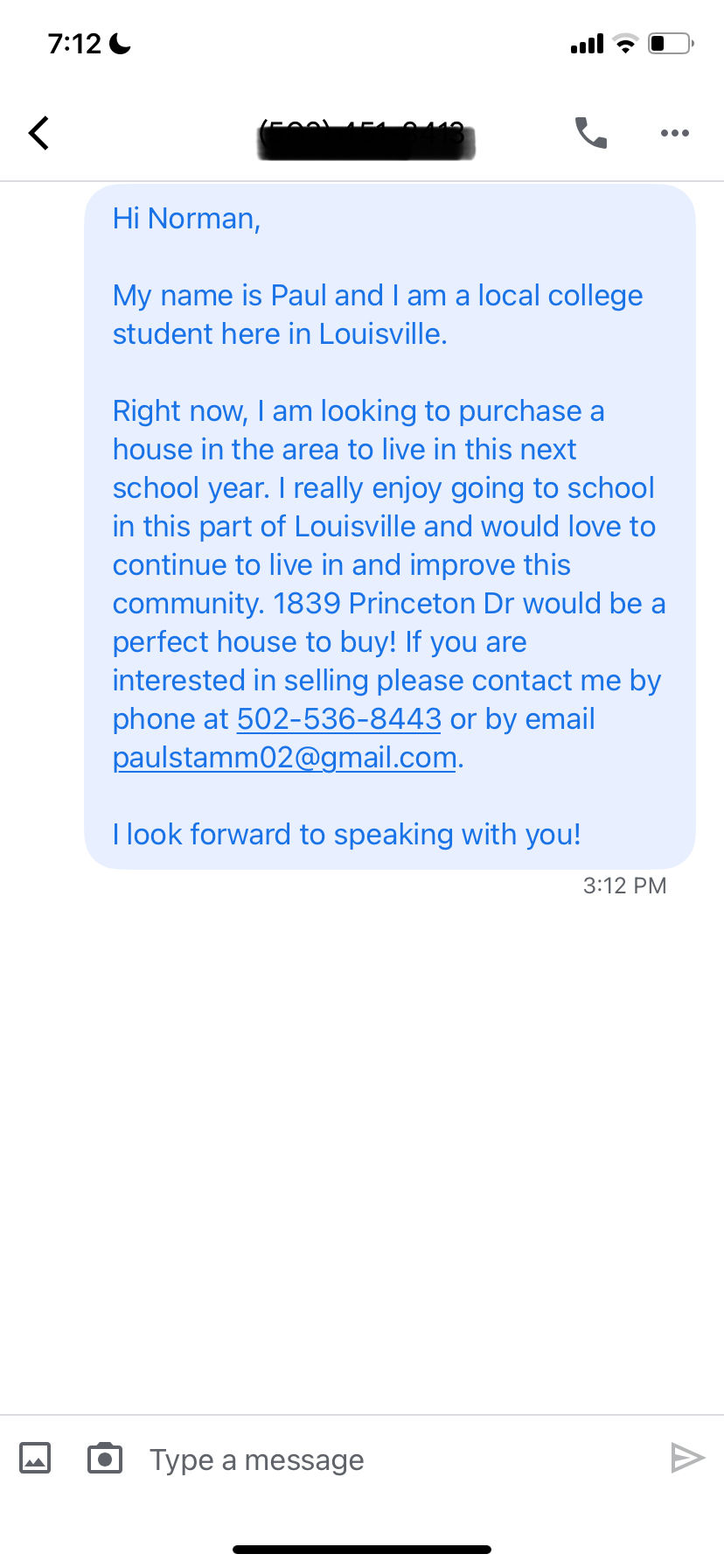 One thing that I really like about texting is that it is pretty easy for me to do. I made a list of homes, found the owners, got their contact information, and sent a text. I sent the same message over and over again and just changed the address and the owner’s name. Here is one of the messages that I sent.